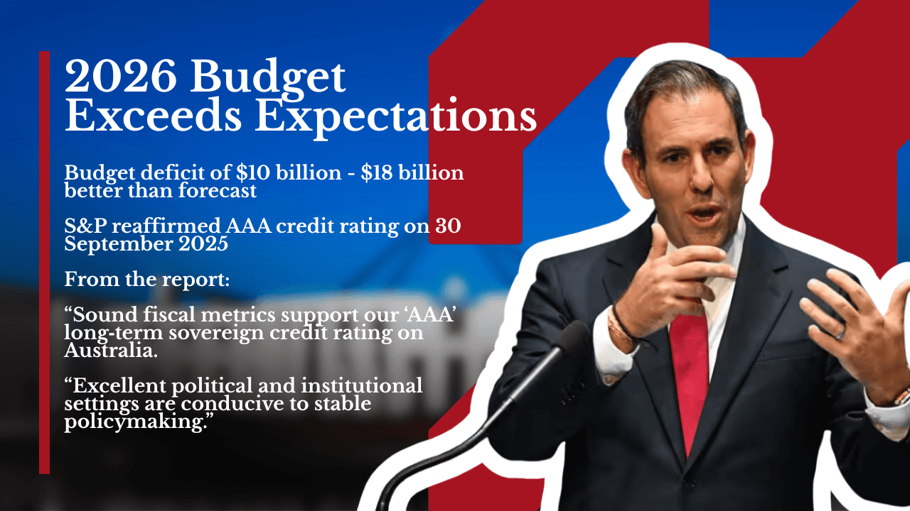 The Final Budget Outcome for 2024-25 delivered an underlying cash deficit of $10 billion - $18 billion better than forecast - with Standard & Poor's reaffirming Australia's AAA credit rating the following day.
