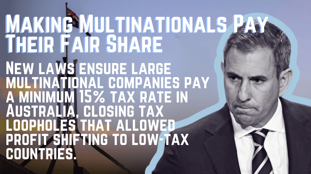 Australia has implemented historic reforms requiring large multinational companies to pay a minimum 15% tax rate, closing loopholes and strengthening our tax system.
